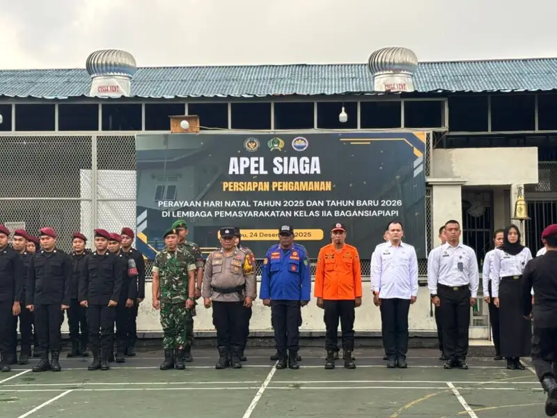 Rokan Hilir, Riau – Kepala Lembaga Pemasyarakatan (Kalapas) Kelas IIA Bagansiapiapi, Agus Imam Taufik, A.Md, IP., SH , MH bersama KPLP, Sigit Pramono, A. Jd., IP., S. Sos, melaksanakan Apel siaga untuk mengantisipasi kemungkinan munculnya gangguan keamanan dan ketertiban terutama pada masa Perayaan Natal 2025 dan Tahun Baru 2026.